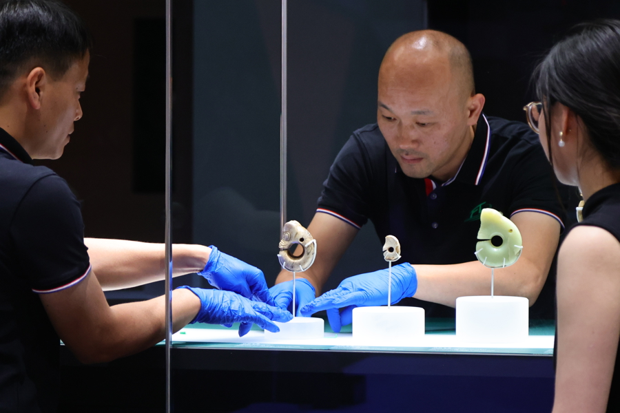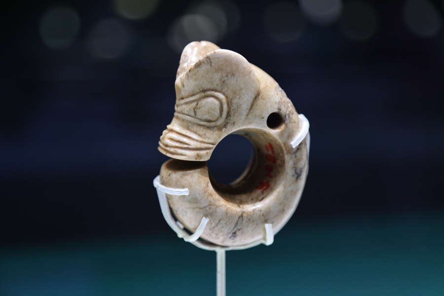 “这件来自辽宁省文物考古研究院的玦形玉龙是首次经正式考古发掘出土的玉龙之一,证明了玦形玉龙源于红山文化,确定了玦形玉龙的文化属性。”作为展览策展人之一,冯雨程表示。通体高10.3厘米,宽7.8厘米,厚3.3厘米,这件意义深远的玉龙1984年出土于辽宁建平牛河梁遗址第二地点一号冢4号墓。“玉龙出土的位置比较特殊,位于墓主人的胸部,且有两条玉龙背对背,或许象征着墓主人的身份。”冯雨程告诉记者。记者了解到,展览中共有十余件玦形玉龙,其中大部分为考古发掘而来。