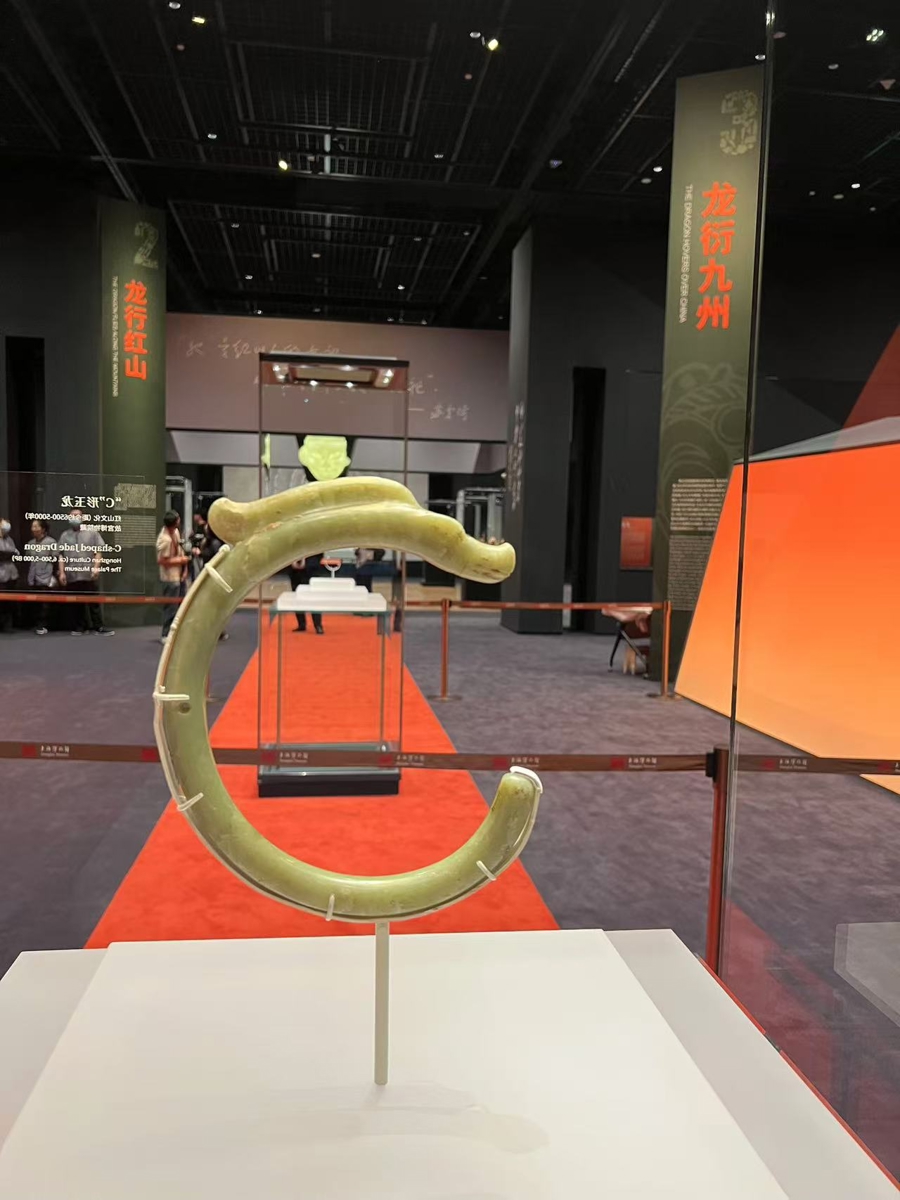 展览中最古老的展品距今约7000-6000年。观众进入展厅,第一眼便能看见的就是故宫博物院藏、有着“中华第一龙”美誉的“C”形玉龙,曲长64.3厘米的“C”形龙是目前发现时代最早的龙形玉器之一。2023年,“中华文明探源工程”研究成果表明,在距今5800-3500年,中华大地上各个区域相继出现较为明显的社会分化,可以划分为古国时代和王朝时代两个时代,“红山文化是古国第一阶段的一个代表。”冯雨程介绍。