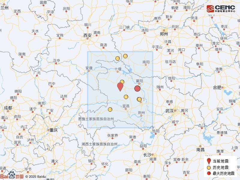 历史地震:根据中国地震台网速报目录,震中周边200公里内近5年来发生3级以上地震共10次,最大地震分别是2025年9月22日在湖北襄阳市保康县发生的3.6级地震(距离本次震中0公里)和2023年1月17日在湖北襄阳市南漳县发生的3.6级地震(距离本次震中100公里),历史地震分布如图。